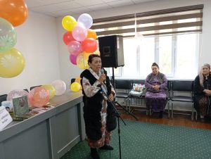 Bayram dasturida Keksalar va nogironligi bo’lgan shaxslar, urush va mehnat fahriylari uchun “Taxiatosh” sanatorisida madaniy tashkillashtiruvchi hodimi Q.Erimbetova 21-oktyabr O’zbekiston Respublikasi Davlat tili haqidagi Qonuni qabul qilinganligiga 35 yil to’lishi munosabati bilan otahon va onahonlarni tabrikladi.
